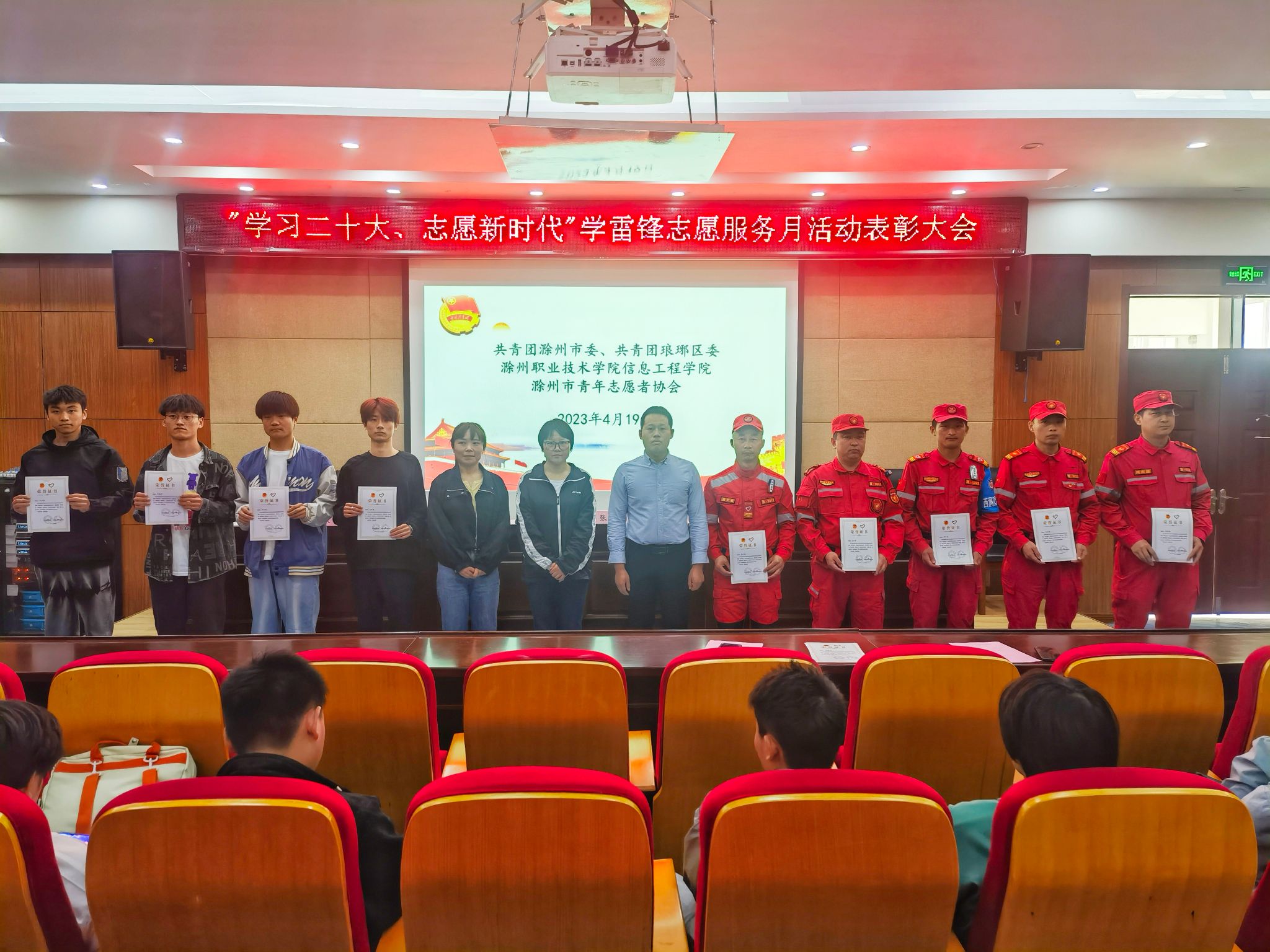 为深入贯彻落实党的二十大精神,表彰优秀志愿者、树立先进典范、凝聚榜样力量。4月19日,信息工程学院团总支在南阶205开展了“学习二十大 志愿新时代”学雷锋志愿服务月活动表彰大会。琅琊区团区委副书记张晨旭、信息工程学院党总支副书记杨阳出席会议并讲话。滁州市青年志愿者协会——青志协救援队及学生代表150余名参加大会,会议由团总支书记朱睿主持。