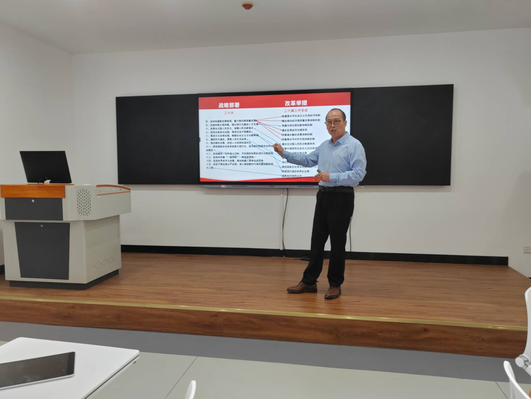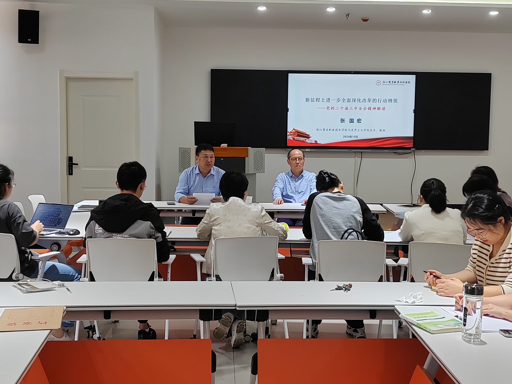 为深入学习贯彻党的二十届三中全会精神,提升思政课教学质量,10月11日,马克思主义学院邀请浙江商业职业技术学院马院党总支书记、院长张国宏教授开展“大师进校园 名师进课堂”活动,于综合楼309会议室作了一场题为“新征程上进一步深化改革的行动纲领——党的二十届三中全会精神解读”的学术讲座。本场讲座由马克思主义学院党总支书记、院长孔金主持,全体专兼职思政课教师聆听了报告。