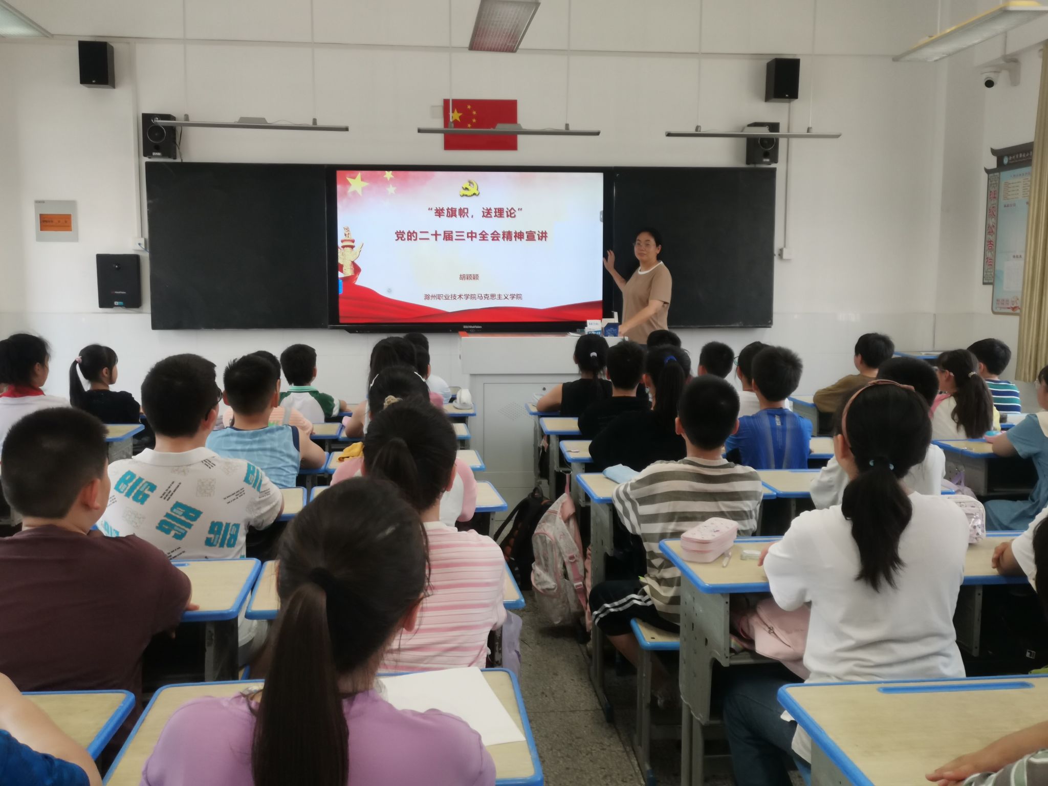 为深入学习宣传贯彻党的二十届三中全会精神,Beat365唯一官方网站马克思主义学院全体教师组建学校教师宣讲团,走进乡镇、社区、企业、中小学,宣讲党的创新理论,9月4日,胡颖颖老师来到解放小学五年级2班开展了“举旗帜,送理论”党的二十届三中全会精神宣讲活动。