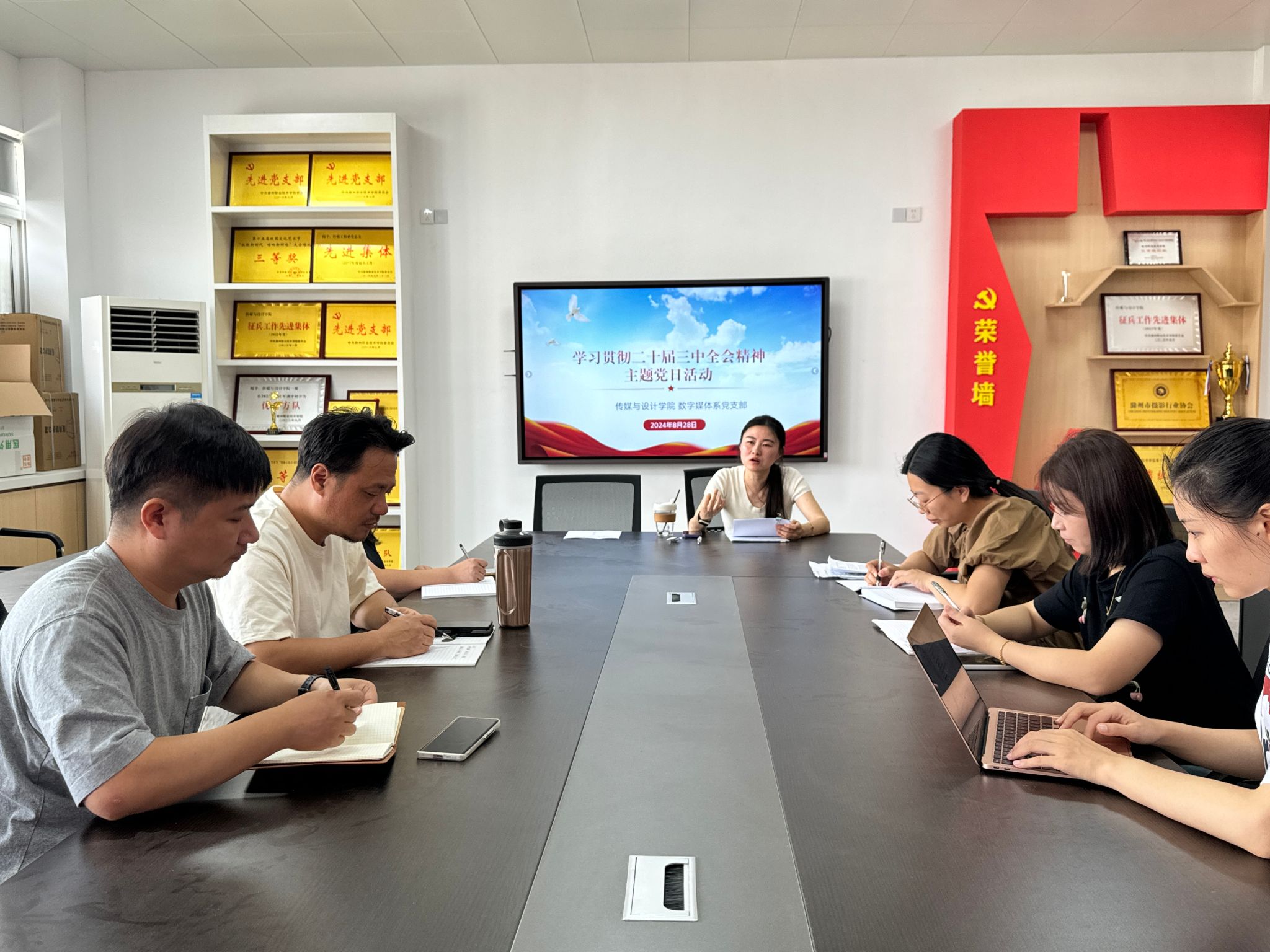 2024年8月28日,传媒与设计学院数字媒体系党支部开展“学习贯彻党的二十届三中全会精神”主题党日活动。党支部书记李雯雯主持,支部党员同志参加。