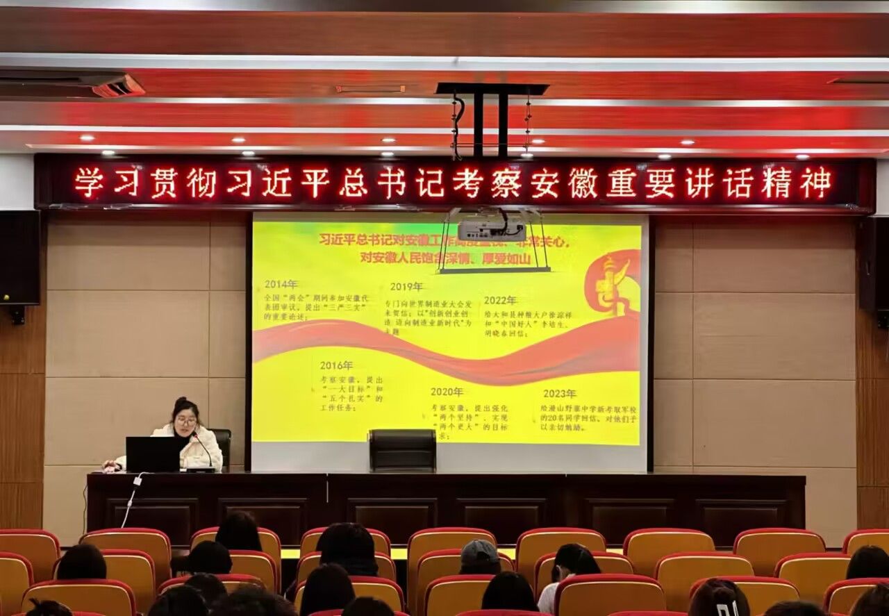 两位老师以习近平总书记对安徽发展的系列关切为切入点,回溯了自党的十八大以来习近平总书记在关键阶段为安徽指引方向的历程,从2014年提出“三严三实”到2024年10月亲临考察,充分彰显了习近平总书记对安徽的深情厚谊与殷切期许。她们用生动的语言、丰富的事例,从 “充分认识习近平总书记考察安徽重要讲话精神的重大意义”“深刻领会习近平总书记考察安徽重要讲话精神的丰富内涵”“切实推动习近平总书记考察安徽重要讲话精神落地生根” 三个维度进行了详细解读。同时,结合滁州当地发展,阐述了如何发挥多重国家战略叠加优势,推动地方经济社会发展,激发学生对家乡发展的责任感与使命感。