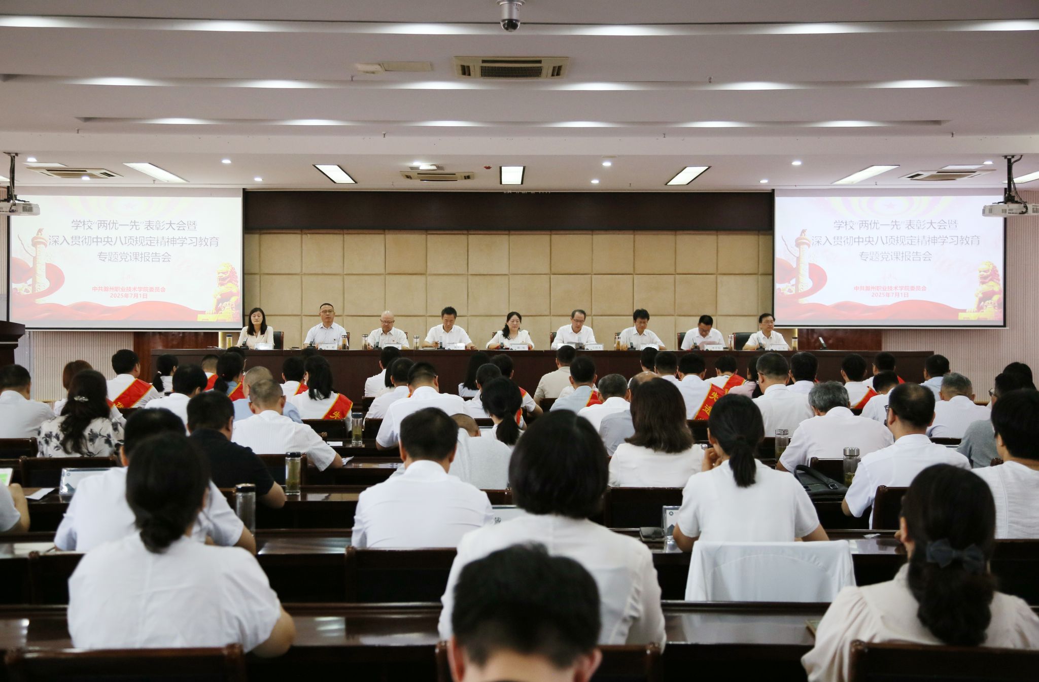 为庆祝中国共产党成立104周年,推动深入贯彻中央八项规定精神学习教育走深走实,发挥先进典型示范引领作用。7月1日,学校党委在综合楼5楼报告厅举办“两优一先”表彰大会暨深入贯彻中央八项规定精神学习教育专题党课报告会。党委书记陈飏出席会议并讲授专题党课。校领导班子成员出席会议,各教学院部、各部门正副职,各党支部书记、“两优一先”获奖人员参加会议。党委副书记、校长许雪峰主持会议。