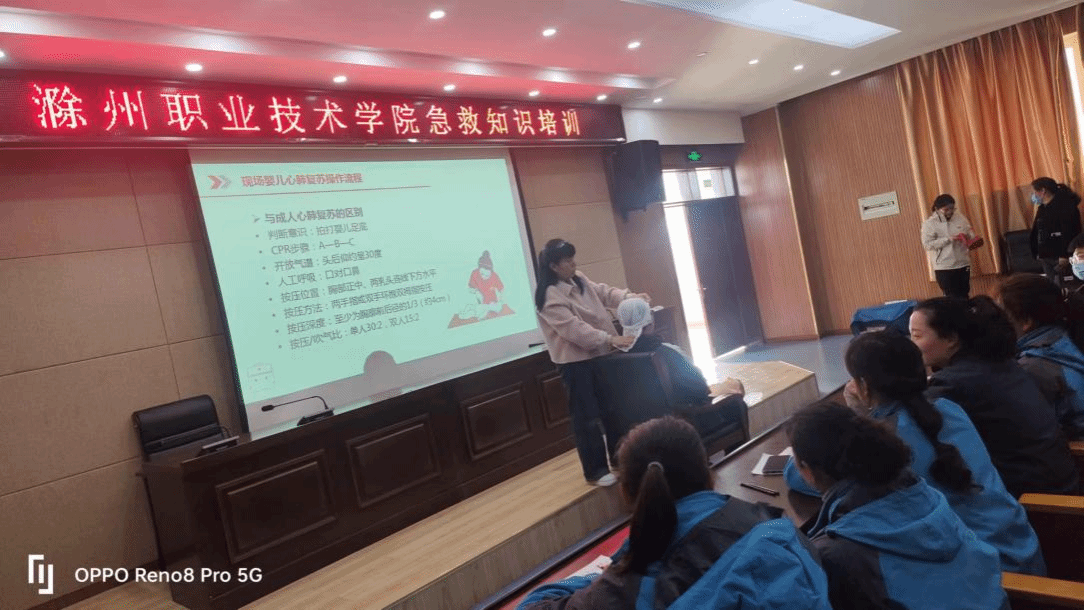 讲解结束后,滁州市南谯区红十字会的其他工作人员用人体模型给大家演示心肺复苏的整体操作流程,每个步骤都详细讲解。同时大家踊跃参与互动,主动上台亲身体验心肺复苏操作。通过医护专家手把手的指导和对初学者容易出现的错误进行了一对一的点评,大大提高培训效果。