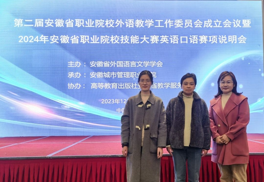 128-10日,由安徽省外国语言文学学会主办、安徽城市管理职业学院承办的第二届安徽省职业院校外语教学工作委员会成立会议暨2024年安徽省职业院校技能大赛英语口语赛项说明会在合肥市举行,基础教学部外语教研室冯香丽、郭敏、乔萍萍三名教师前往参会。