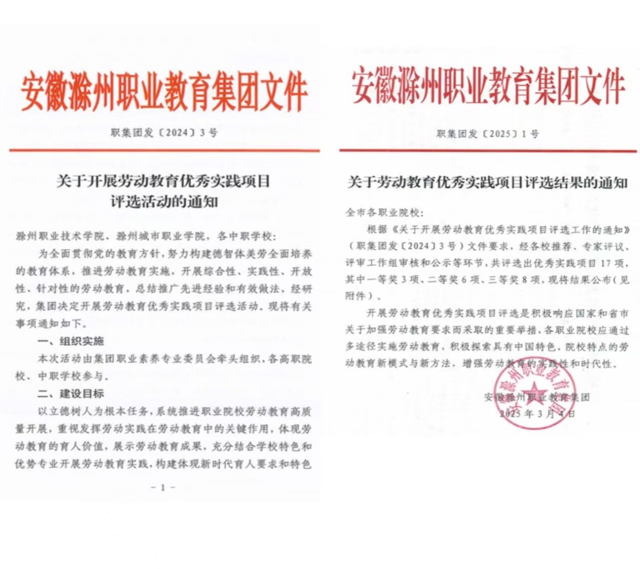 职业素养专业委员会自2024年12月20日成立当日即启动专项工作,面向滁州市各高职院校和中职学校发布《关于开展劳动教育优秀实践项目评选活动的通知》(职集团发〔2024〕3号)。经各校推荐申报后,于2025年2月24日,组织专家评审,最终经过评审工作组审定及公示环节,于2025年3月4日公布评选结果,共评选出优秀实践项目17项,其中一等奖3项、二等奖6项、三等奖8项。