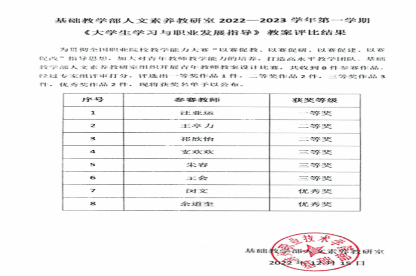 此次教案比赛为青年教师营造了一个交流学习、共同进步的良好氛围。人文素养教研室也以本次比赛为抓手,为进一步加强教师队伍建设,提升青年教师的教学能力和教学水平,更好完成下学期教学工作打下了坚实基础。