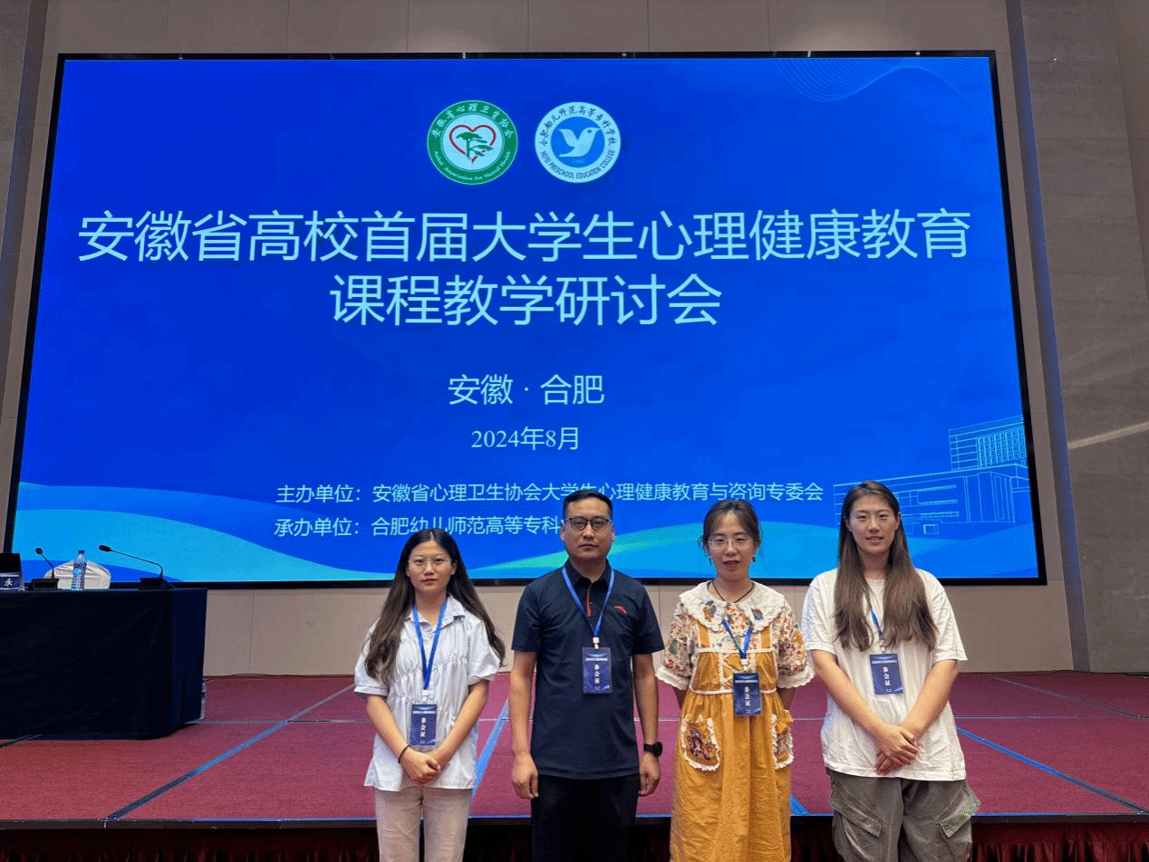 为有效提升学校心理健康教育课程的教学质量,提高专任教师的教学水平,8月16日至8月18日,基础教学部副主任(主持)刘杰带领心理健康教育教研室三名教师赴合肥参加安徽省高校首届大学生心理健康教育课程教学研讨会,会议由安徽省心理卫生协会大学生心理健康教育与咨询专委会主办,合肥幼儿师范高等专科学校承办。