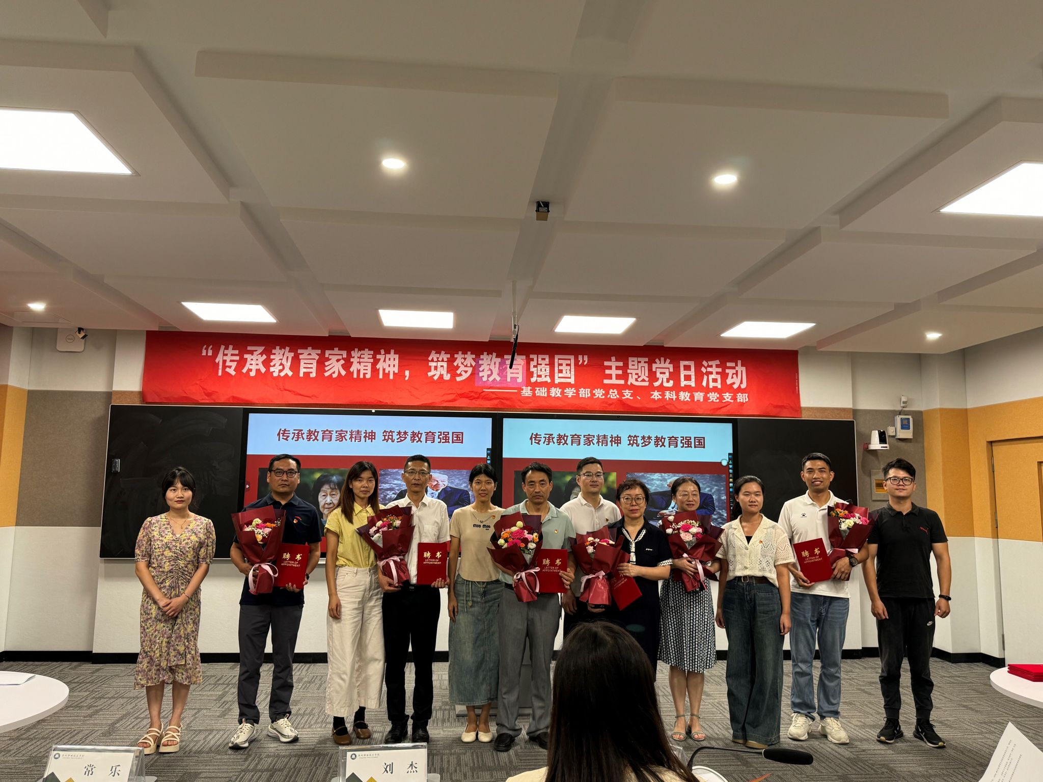 仪式伊始,基础教学部副主任刘杰宣读了教研室结对及“师徒”结对名单,明确了结对双方的工作职责和具体要求。接着,校党委委员、组织人事处处长王宇为各位指导教师、结对教研室主任颁发聘书,新教师及新任教研室负责人为自己的指导教师和结对教研室主任献上鲜花,以此表达敬意与感谢。整个仪式在庄重而和谐的氛围中进行,展现了教育工作者对教育事业的尊重与承诺,以及教师之间相互支持、共同进步的精神。
