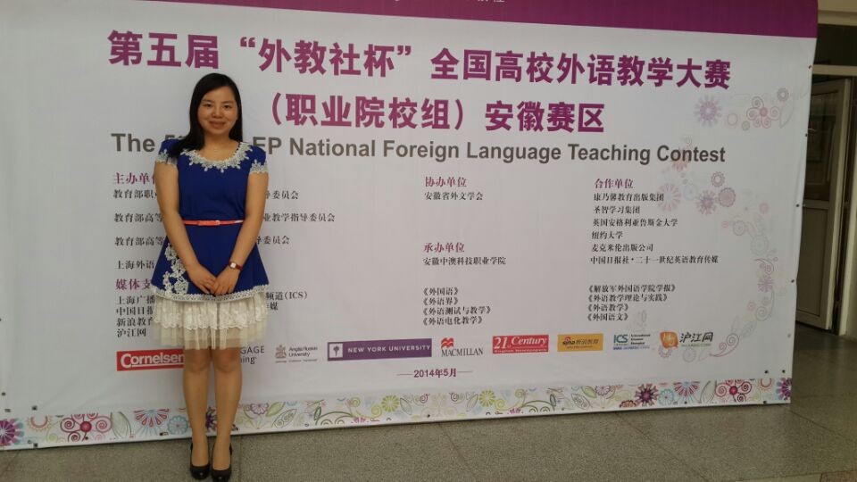 2014年5月30日基础部英语教研室许欣老师参加了由教育部高等学校外国语言文学类专业教学指导委员会、教育部高等学校大学外语教学指导委员会、教育部职业院校外语类专业教学指导委员会和上海外语教育出版社主办的第五届“外教社杯”全国高校外语教学大赛(职业院校组)安徽赛区复、决赛,获得了三等奖。基础部英语教研室主任周婕老师担任了本次安徽赛区复赛评委。