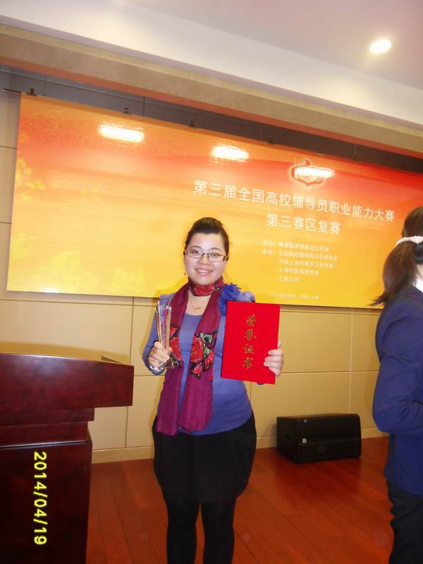 谢丽丽老师很阳光开朗很聪慧,有种意气风发的青春之志。每天备战比赛复习到深夜,第二天仍然精神抖擞的上班,她的刻苦和年轻让我即钦佩又羡慕。指导起这样的年轻人,不觉得是指导,而是相互学习,共同进步。赛场上,面对来自复旦大学、上海交大、浙江大学等等这些头衔赫人的选手,她毫不怯场,落落大方,清晰流畅地介绍着自己工作的体会和成绩,富有特色的工作和展示让很多评委微笑点头赞许。在主题演讲阶段,她饱含对辅导员工作深刻思考和对学生一片挚爱的故事叙说令全场一片安静,她介绍着高职生的可爱之处与教育难题,让这些来自985、211的高校评委们重新认识了高职教育和高职生群体。当我周围的其他学校的老师知道我们是一起的,于是纷纷询问你们是哪个学校的,哦,Beat365唯一官方网站?!嗯?滁州在哪里?我微笑并自豪的小声介绍。恰巧,我的一个大学同学也作为他们选手的带队领导来现场观摩,特意跟我说:想不到啊,你们学校挺厉害的呀,作为高职院校能做出这样的特色和成绩!我满心高兴却不忘谦虚:哪里哪里,我们是来学习的,高手如云啊。