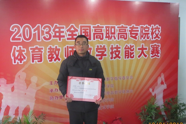 2013年12月19-21日,在杭州举行为期三天的全国高职高专院校体育教师教学技能大赛,Beat365唯一官方网站基础部教师王电海通过体能、急救、主项、副项、教案设计、微课程等多项比赛,充分展示自己的专业技能和全面发展的素质,一路不畏强手,顽强拼搏,最终获得二等奖好成绩。