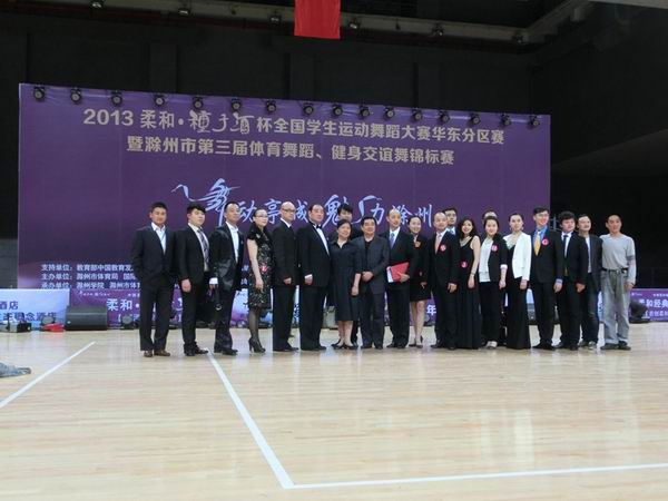5月10-12日, 2013“柔和•种子酒”杯全国学生运动舞蹈大赛华东分区赛在滁州市新体育馆隆重举行。来自华东六省一市的1500多名运动员参加了健美操、拉丁舞、东方舞、民族舞等项目的角逐。基础部王厚红老师参加健美操比赛的裁判工作,同时又受组委会安排协助处理部分会务工作。此次大赛的裁判队伍由来自全国各地的24名国际级、国家级和国家一级裁判员组成,教育部两操协会运动舞蹈专项委员会主任李建安先生担任总裁判长。比赛期间,王厚红老师认真评判、严格执裁,同时积极向其他资深评委请教、学习,资深评委老师们规范的言行举止、严谨的工作态度成为大赛中一道靓丽的风景。开幕式现场还举行了隆重的裁判员授牌仪式,Party式的颁奖使现场成为欢乐的海洋,运动员们在比赛中充分享受了运动带来的乐趣。