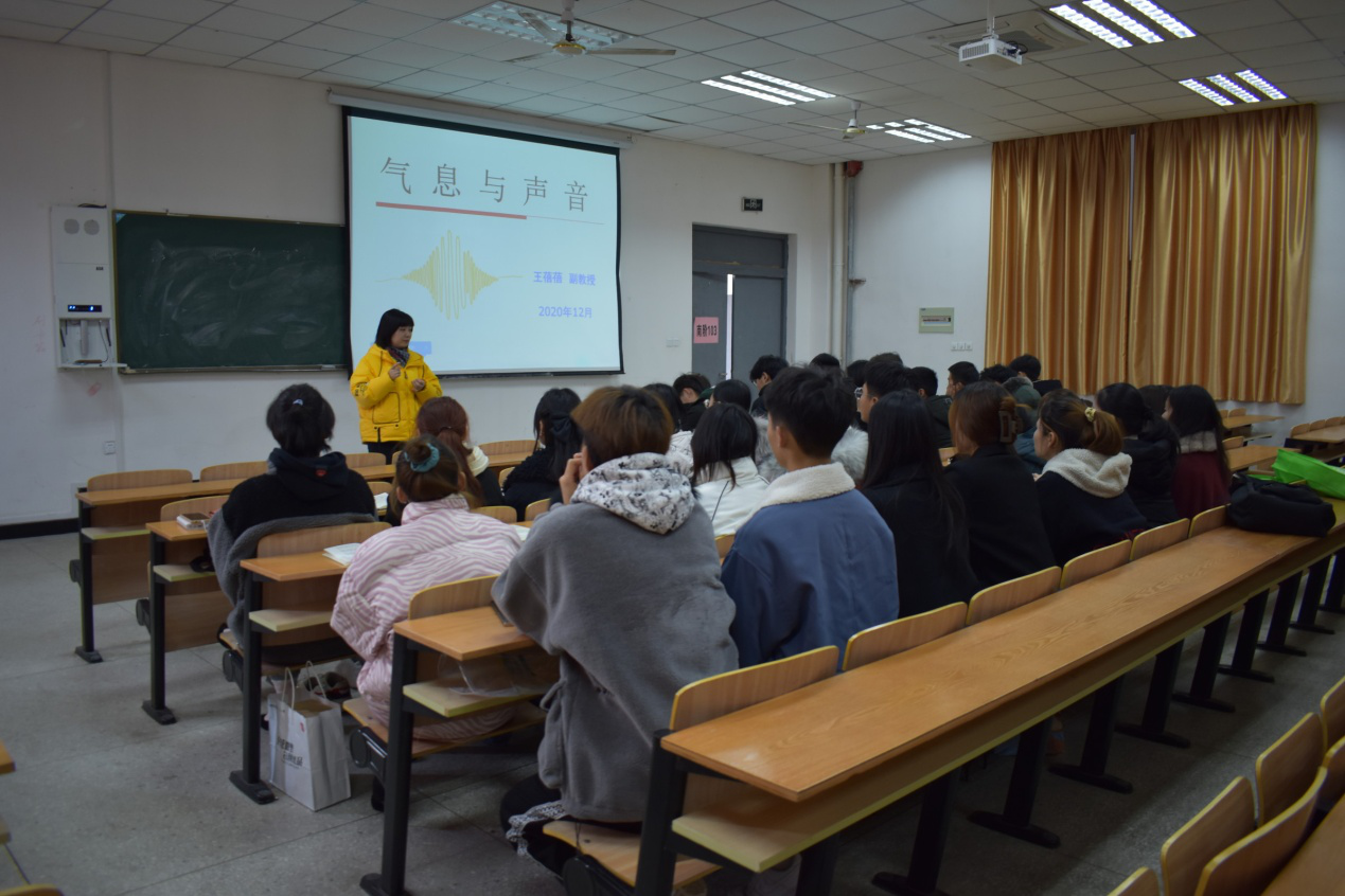 为提升学生艺术审美和人文素养水平,指导师生掌握科学的发声方法,12月16日下午,基础教学部在南阶103教室举办了“气息与声音”专题讲座,来自广播站、合唱团、艺术团的成员及部分教师聆听了此次讲座。讲座由王蓓蓓副教授主讲。