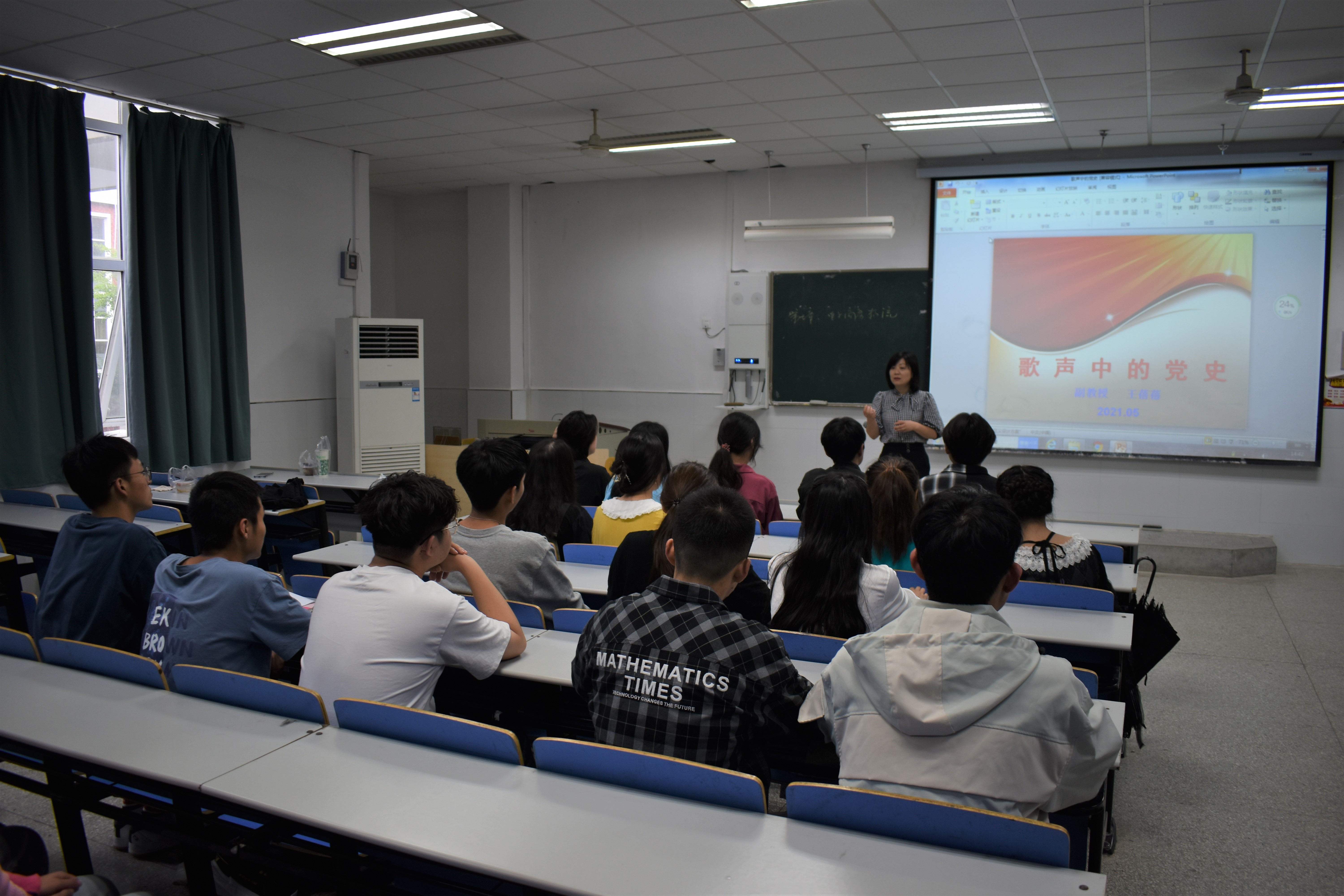 5月26日下午2:30,基础部在1106教室举办“歌声中的党史”讲座,来自广播站、合唱团、艺术团的同学及部分教师聆听了此次讲座,讲座由人文素养教研室副教授王蓓蓓主讲。