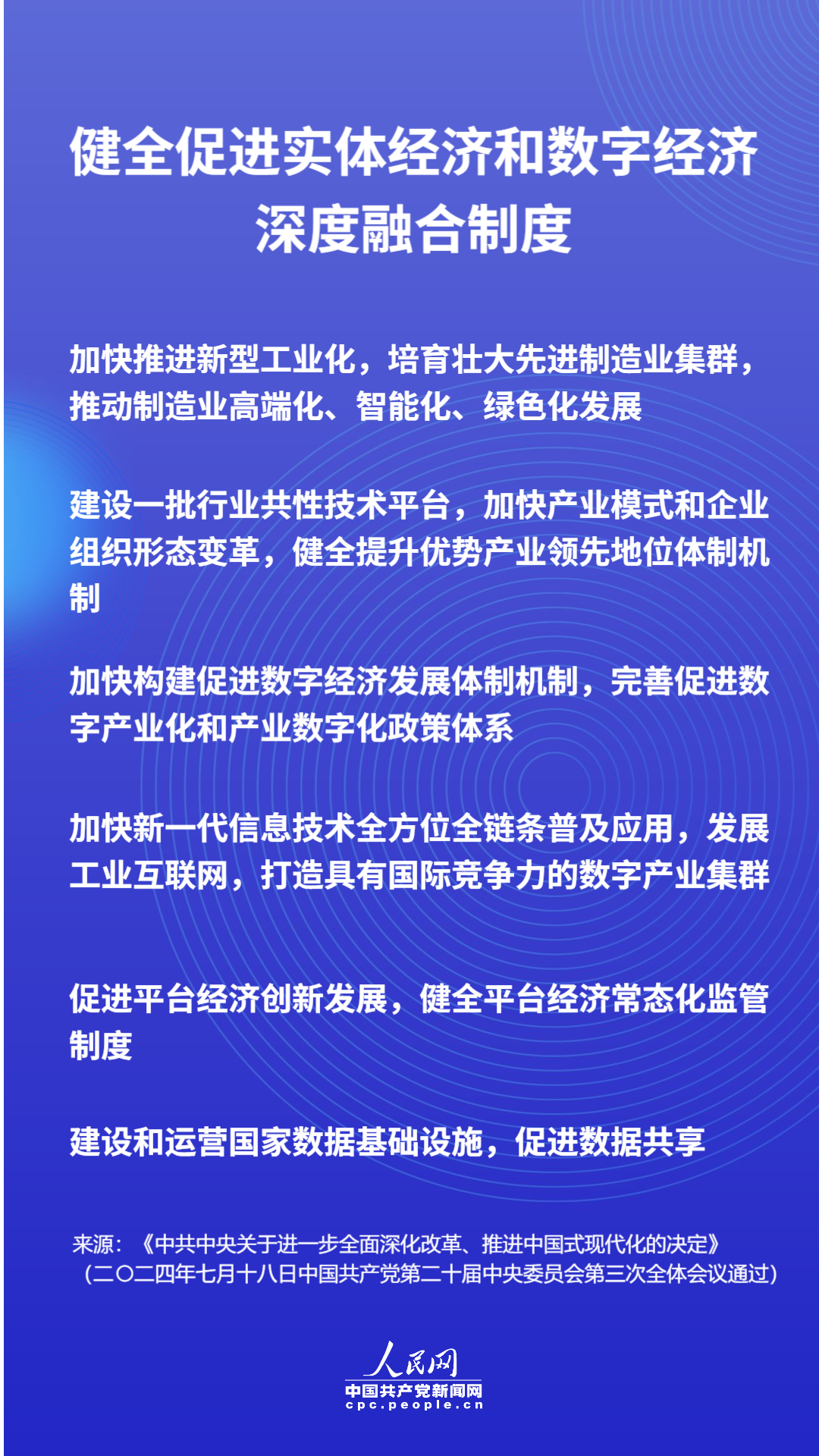 本期主题:党的二十届三中全会审议通过的《中共中央关于进一步全面深化改革、推进中国式现代化的决定》提出健全促进实体经济和数字经济深度融合制度,对加快推进新型工业化、加快构建促进数字经济发展体制机制、完善促进数字产业化和产业数字化政策体系等作出新的部署。数字经济快速发展必须依托实体经济支撑,实体经济转型升级需要依赖数字经济加持。只有数实深度融合发展,相互支持相互促进,才能充分发挥二者的叠加效应、乘数效应、指数效应、倍增效应作用,促进整个经济实现质的有效提升和量的合理增长。