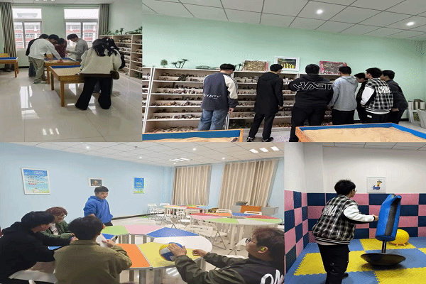 在大学生心理健康教育中心,同学们兴致勃勃地参观了预约接待室、个体咨询室、宣泄室、音乐治疗室、团体辅导室和沙盘室等多个功能室。通过老师细致入微地讲解,同学们了解了心理健康中心的工作定位和理念,熟悉了心理咨询的流程和预约方式。