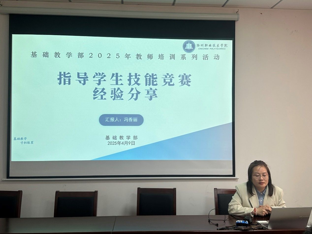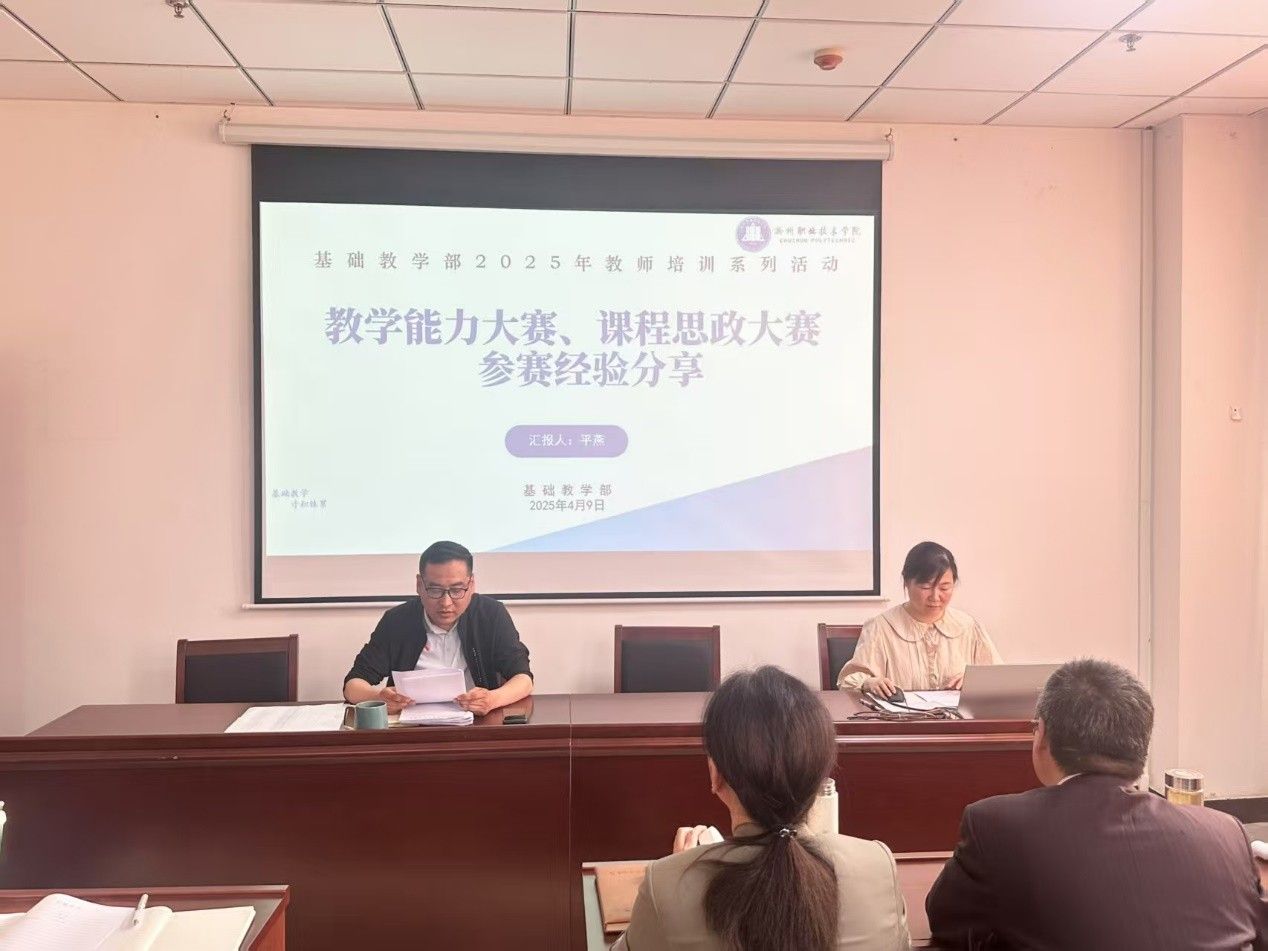 按照《基础教学部2025年教师培训方案》,4月9日,基础教学部在综合楼318室开展教师培训活动,本次培训为“精研竞赛,育匠培优”教师专业能力进阶讲座,也是先锋讲堂系列讲座的一部分。培训包含两个部分:一是人文素养教研室主任平燕分享教学能力大赛、课程思政大赛经验;二是外语教研室主任冯香丽分享指导学生技能竞赛经验。基础教学部党政负责人及全体教师参加,培训由刘杰主持。