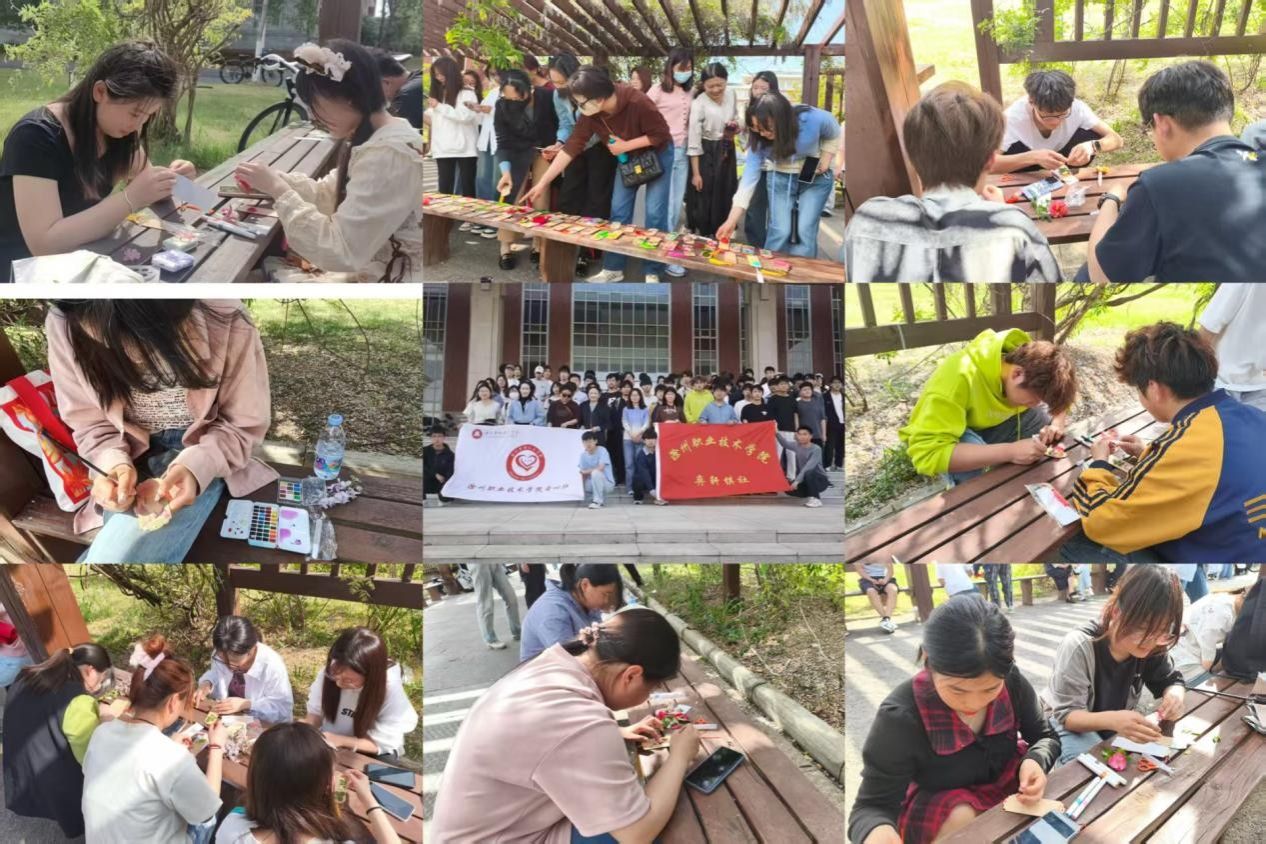 活动伊始,大家漫步在校园中,拾捡樱花、玉兰、山茶花、紫藤萝等春日素材,在绿意盎然、繁花似锦中寻找创作灵感。随后在紫藤长廊进行书签创作,在手工创作环节,学生将“春风拂过,万物萌动,处处充满生机”“簪花踏青”等诗句誊写于素笺,或绘制春日图案,让书签承载春日的诗意与哲理,实现优秀传统文化与现代设计巧妙结合。活动现场还特邀专业教师现场指导,让学生们在绘画、压花、拼贴等基础技法上叠加创意深度。