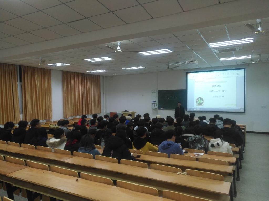 2019年12月11日晚上18:40,郭栋副教授在南阶103教室举办了“分析的方法-微分”的学术讲座。全校对极限来源感兴趣的90多名同学聆听了此次讲座。