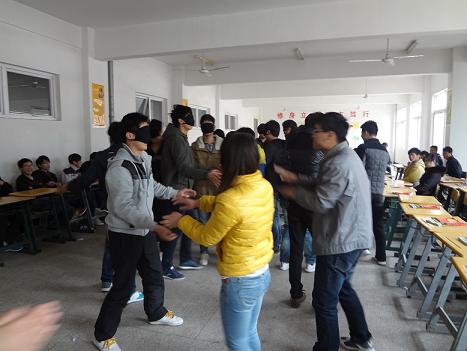 班会第一项为电视剧讨论,全体同学围绕着电视剧《学校2013》展开了积极的发言,两班同学都纷纷表示,从这部剧中体会到了很多有意义的东西,有同学之间的友情,老师对于学生的爱护、培养之心,以及永远不要放弃的决心。接着开始了一个名为“死亡危机”的游戏,由20名同学来体验在5分钟的黑暗世界里,体会一个人的茫然、孤独、受挫等情绪。在悲情音乐背景的衬托下,被蒙上眼罩的同学,在看不见的黑暗中摸索和寻找自己的队友。当他们找到自己的“亲人”,找到自己的队友时,他们激动万分,双手紧紧握在一起,任其他同学如何拉扯,也不能把他们分开。一首《感恩的心》让游戏达到预想的高潮。他们久久拥抱在一起。他们所有人在之前并不熟悉,可就在那一刻,他们就是彼此最亲的亲人。音乐落下,眼罩摘下,他们看着自己的队友,眼神中有着之前所没有的感情,同学的情谊,那是一种感恩,感谢在黑暗中你紧紧握住了我的手!