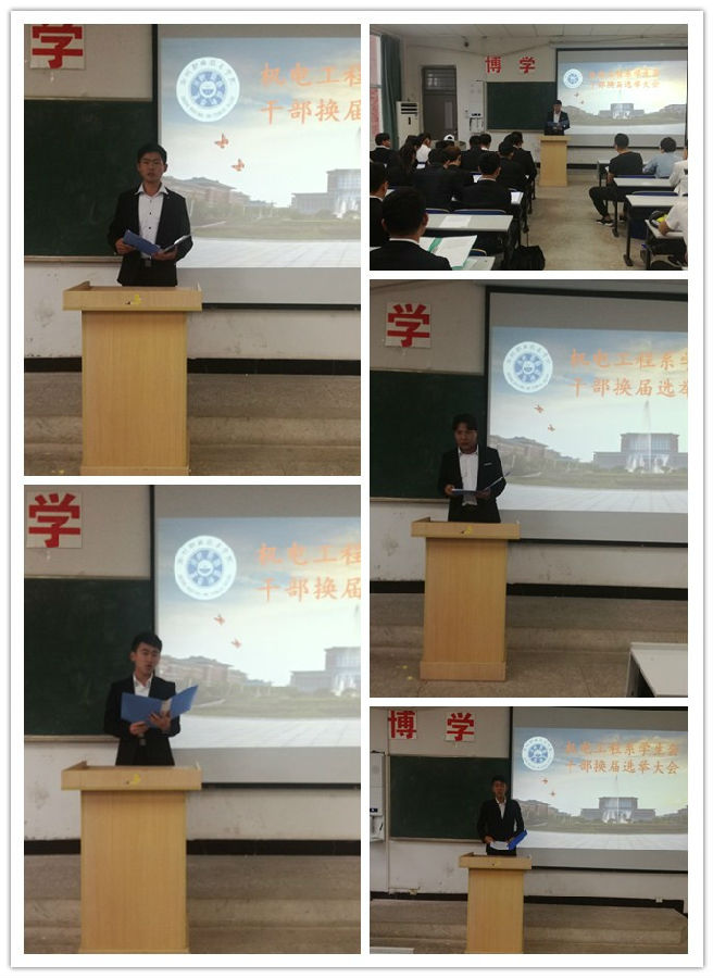 会议开始后,首先由主席团候选人发表竞选演讲,共有11名学生参加主席竞选;演讲结束后,进行投票。接着是各部长进行竞选演讲。演讲中,他们都表现出积极的工作态度,以及对学生会今后工作的规划部署,一字一句吐出了他们对学生会的诚挚感情,相信新一届的机电系学生会在他们的带领下,将会发展的更好。最后张文老师对所有参加竞选的同学表示感谢,感谢大家愿意为机电系的发展贡献自己的力量。