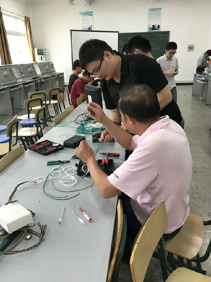 我系综合模拟实训室始建于2001年,随着实训设备逐渐老化和工业控制技术的更新换代,该实训室已不能满足我系PLC实训课程的教学需求,在今年申报新建PLC实训设备再次流标的情况下,为了不影响日常教学正常开展,在机电工程系主任杨思国的支持下,各教研室主任积极响应,利用周末休息时间,不计报酬,自带工具来到实训室,从钻孔、磨导轨圆角、打线号、接线到安装计算机和PLC 、安装调试软件全部由老师带领学生自主完成。整个改建过程中严格遵守工业技术规范,发扬工匠精神,高标准严要求完成每一个技术环节,改建效果完全符合教学需求。