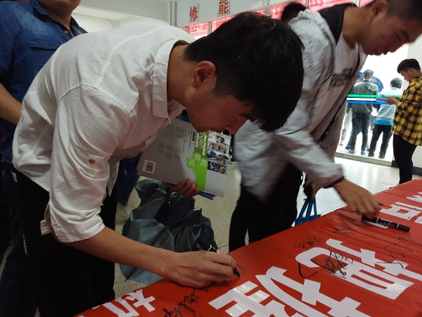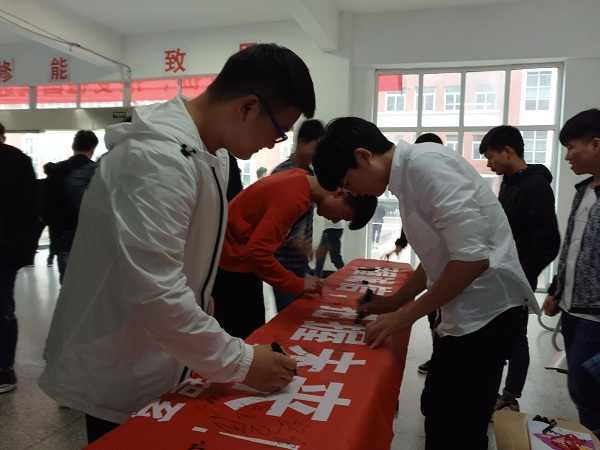 活动开始,在我系学生会干事的宣传下,同学们纷纷有秩序地来到横幅前,并郑重的签下自己的名字,每个名字都深深地印在有“手握诚信,把握未来”的红色横幅上,也深深地印在了心里。活动的最后,学生会的各部门学干也同样在横幅上留下了自己的名字,作为学干更应自觉加强诚信建设,做好领头羊的作用,用实际行动践行社会主义核心价值观。