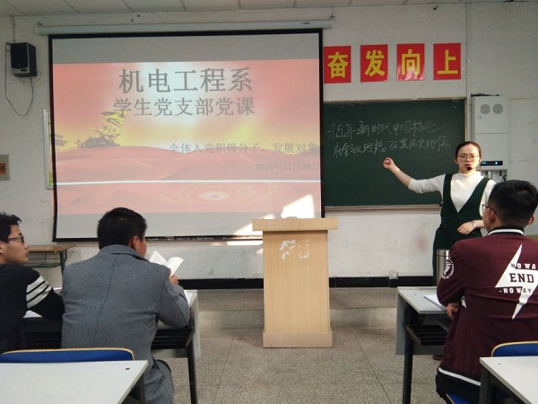 为了让我系入党积极分子进一步了解习近平新时代中国特色社会主义思想,机电系学生党支部于2018年11月28日下午3点在5102开展“习近平新时代中国特色社会主义思想历史地位”党课学习,由夏舒老师主讲,机电系学生党支部全体积极分子和发展对象参加。