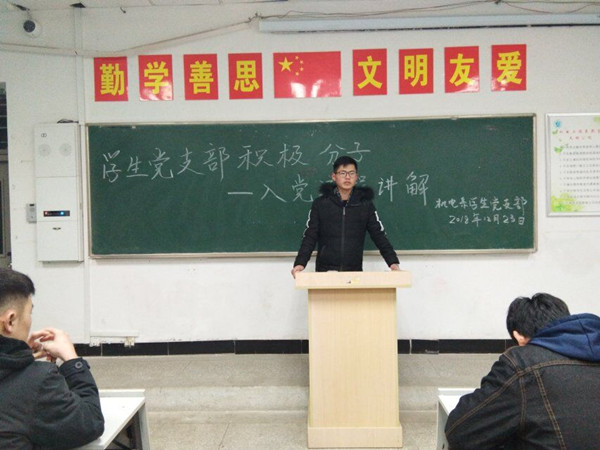 机电系学生党支部于12月23日晚7点在5102开展发展党员工作流程及相关党务知识讲解,机电系学生党支部全体入党积极分子参加,此次会议由学生支部选派预备党员胡远港,张田博到场谈了切身感受。