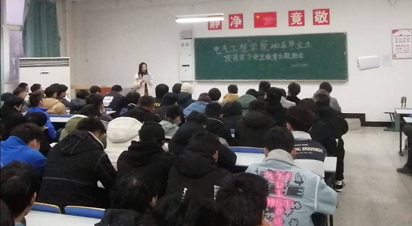 为帮助同学们顺利完成顶岗实习任务,电气工程学院于2021年11月30日下午17时10分在北阶102教室召开2022届毕业生顶岗实习暨安全教育主题班会,本次出席会议的有19级毕业班全体学生、20级五年制全体学生,共计227人。2022届毕业生辅导员朱兰芳老师主持会议。