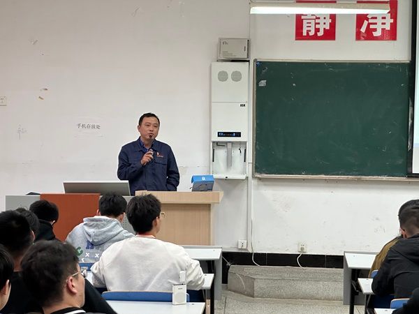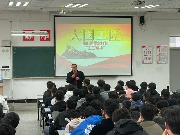 随后,沈家文先生用朴实的语言分享了在工作岗位上执着专注、技能锤炼、敬业奉献、干一行爱一行的个人事迹。用自己的亲身经历为大家传递着精益求精、爱岗敬业、执着专注、勇于创新的工匠精神。并说到“以自身经历,来带动同学们,学好技术为国家作出贡献”