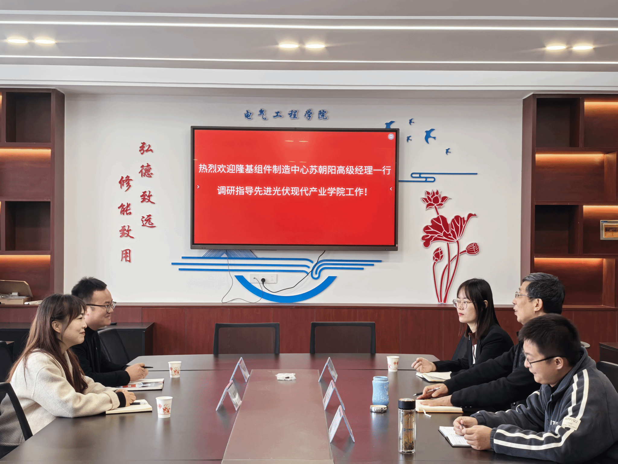 12月5日上午,隆基集团组件制造中心高级经理苏朝阳、滁州隆基乐叶光伏科技有限公司人力资源部人才培养经理陈来彬来校调研光伏产业学院工作,电气工程学院院长张信群热情接待了苏朝阳一行。