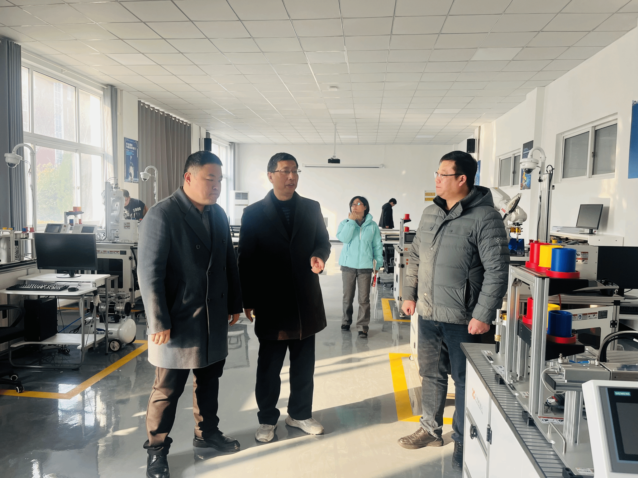 座谈会后,张信群陪同代兵一行参观了专精特新工业机器人产业学院实训基地、先进光伏现代产业学院光伏实训室以及正在建设中的光伏科技馆。代兵不时驻足询问相关专业教师实训设备的功能和实训项目的设置,对学校注重学生实践操作能力培养表示高度赞同。