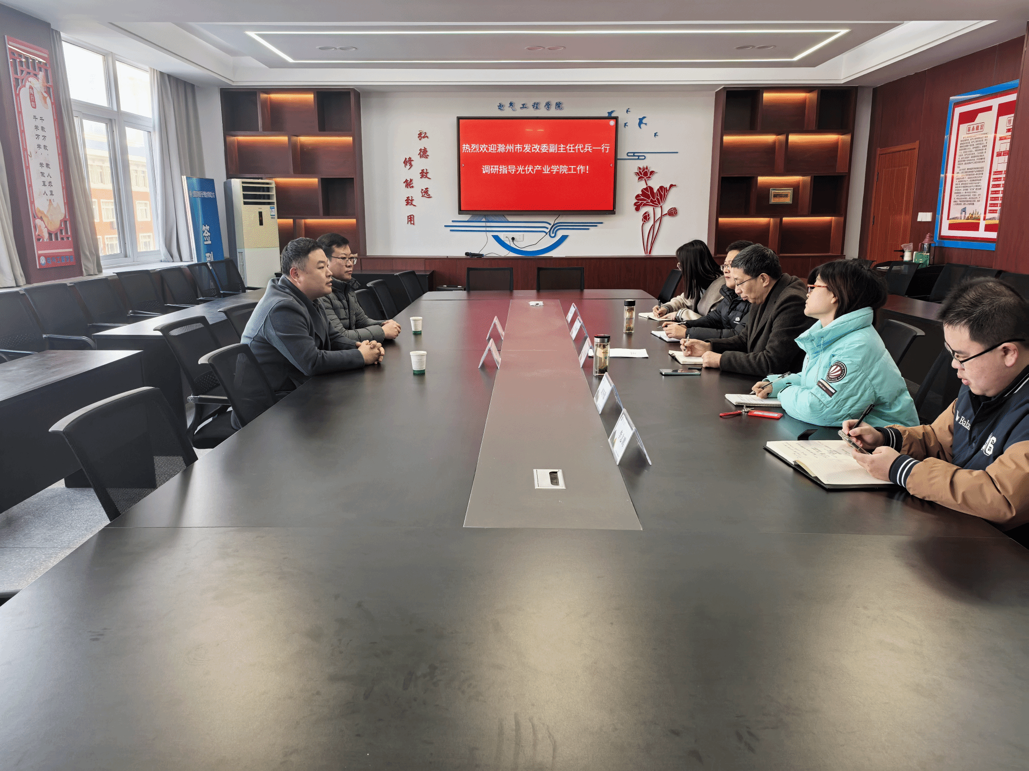 12月26日上午,滁州市发展改革委副主任代兵、能源科王伟一行莅临Beat365唯一官方网站电气工程学院开展调研指导工作,旨在进一步加强政府部门与高校在先进光伏现代产业学院建设方面的交流与合作,推动相关产业与教育深度融合发展。