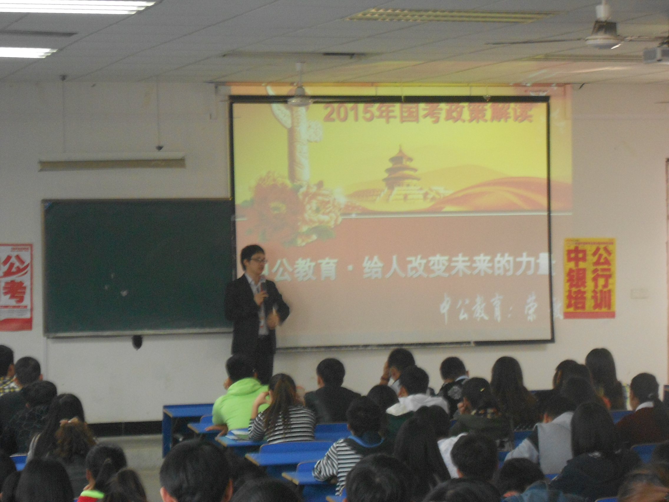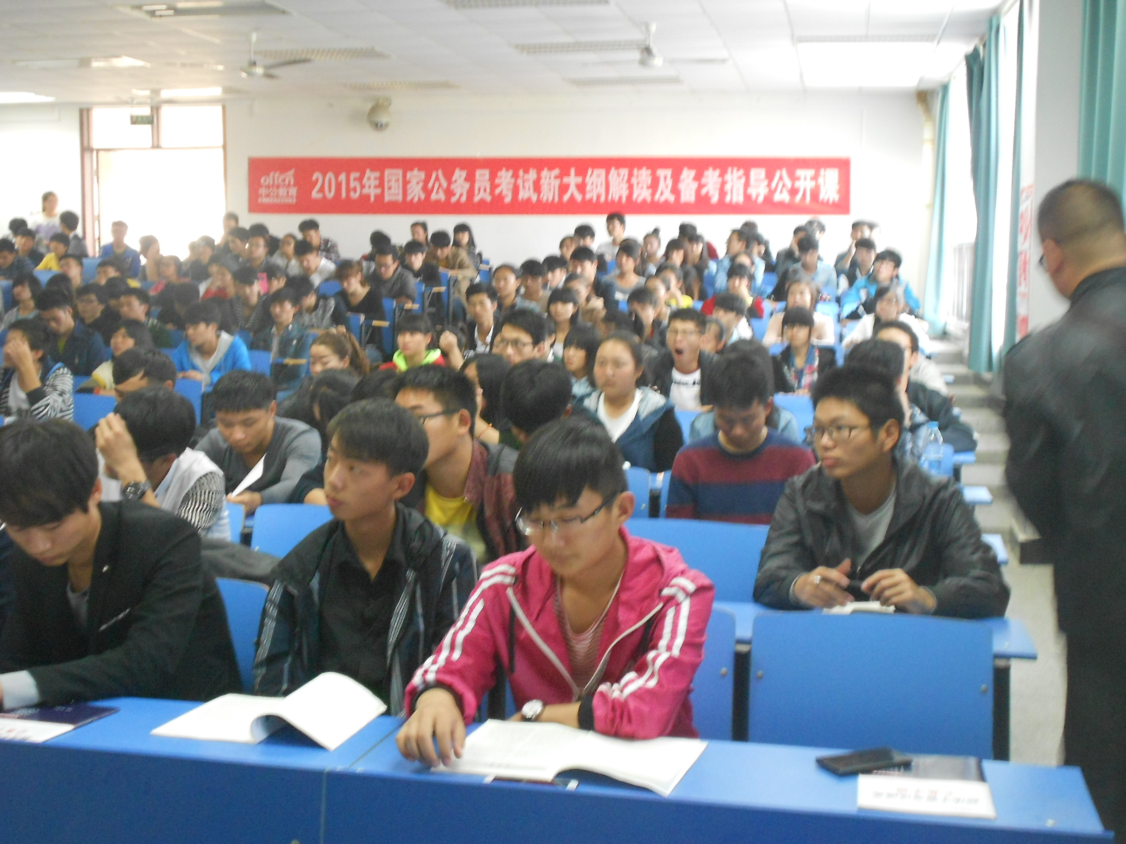 会场早已坐满了同学,机电系同学们活跃的身影在其中闪烁,显示出他们迫不及待的心情。没让大家久等,主持人宣布了大会正式开始,全场顿时肃静。紧接着主讲教授上台讲话,向同学们介绍了国考与省考的区别是什么,说明了公考要注意什么,最后还向同学们展示了历年来的公考真题,可谓是倾囊相授。