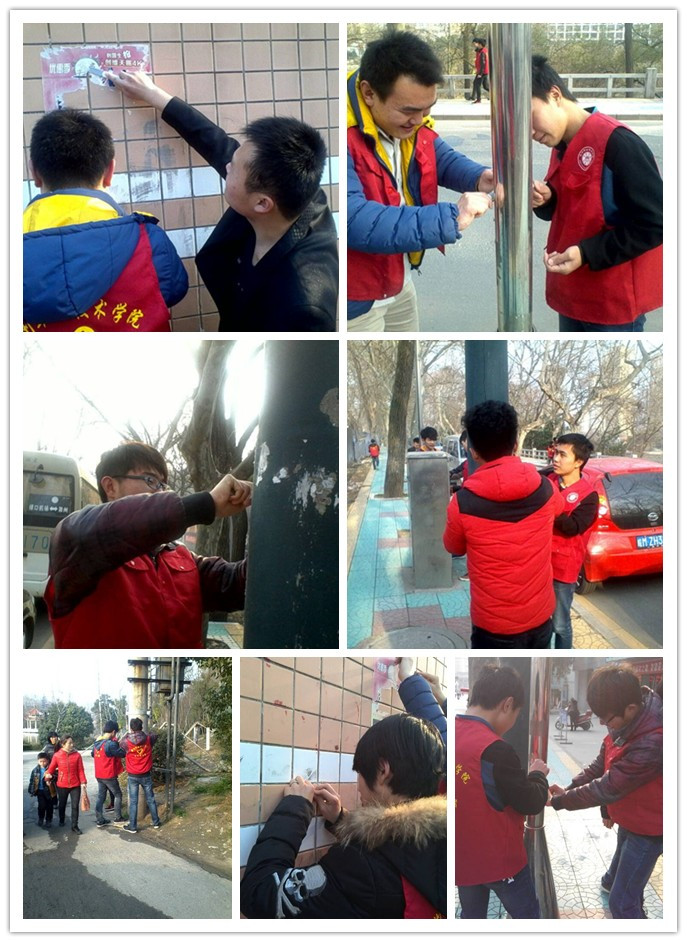 3月9日下午3点开始,志愿服务者自带小刀、垃圾袋、抹布等小工具,不怕脏、不怕累,对市中心和南湖公园的周边地区的灯杆、公交站牌上粘贴的小广告进行了集中清理,对公交站台座椅、果皮箱进行了擦洗和维护。下午6时左右,活动顺利结束,活动后同学们合影留念、分享感想。