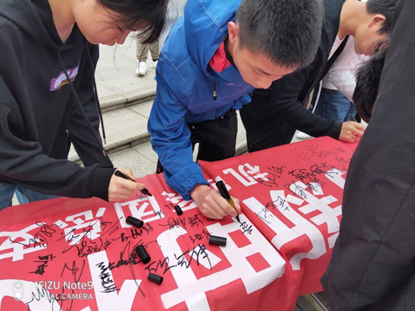 活动伊始,伴随着雄壮的国歌声响起,机电系国旗护卫队的成员,迈着整齐的步伐,向国旗护卫台走去,五星红旗冉冉升起。全体同学注目行礼,表达出自己对祖国的热爱。随后,我系郝文峰代表团员进行发言,他表示新时代青年要勇于担当,知行合一,不忘初心,牢记使命,承担起青年的责任。最后,所有同学在“青春心向党,建功新时代”的横幅上签名,升旗仪式圆满结束!