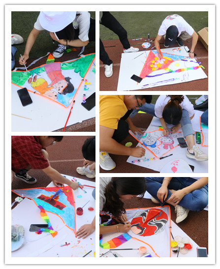 在主持人介绍完比赛规则后,每组参赛人员领取了比赛用品,围着风筝坐成一圈,大家发散思维用画笔风筝上绘出对祖国的热爱。从五星红旗天安门长城到母爱、脸谱青春记忆,都充分体现了新时代新青年的风采,他们用这种方式表达了自己心目中的祖国。最终经过评定,机电系和食环系参赛队获得本次比赛一等奖。