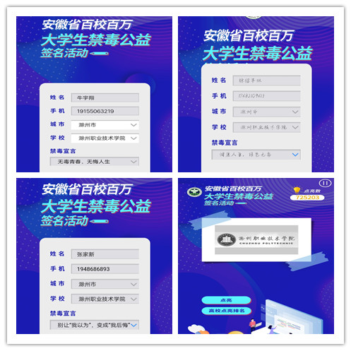 学生利用网络进行禁毒知识专题学习,了解毒品的危害和相关法律,并积极参与禁毒竞赛活动;与此同时,在活动页面参与个性禁毒签名,点亮个人禁毒公益头像。