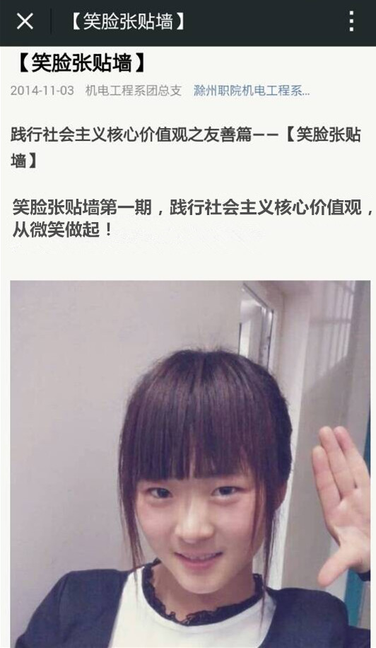 近日,机电系团总支的微信公众号上出现了这样一个专栏。专栏里面充满了最纯真、最友善的同学们的笑脸照片。这就是机电系团总支践行社会主义核心价值观之友善篇的活动——利用微信公众平台发起【笑脸张贴墙】。
