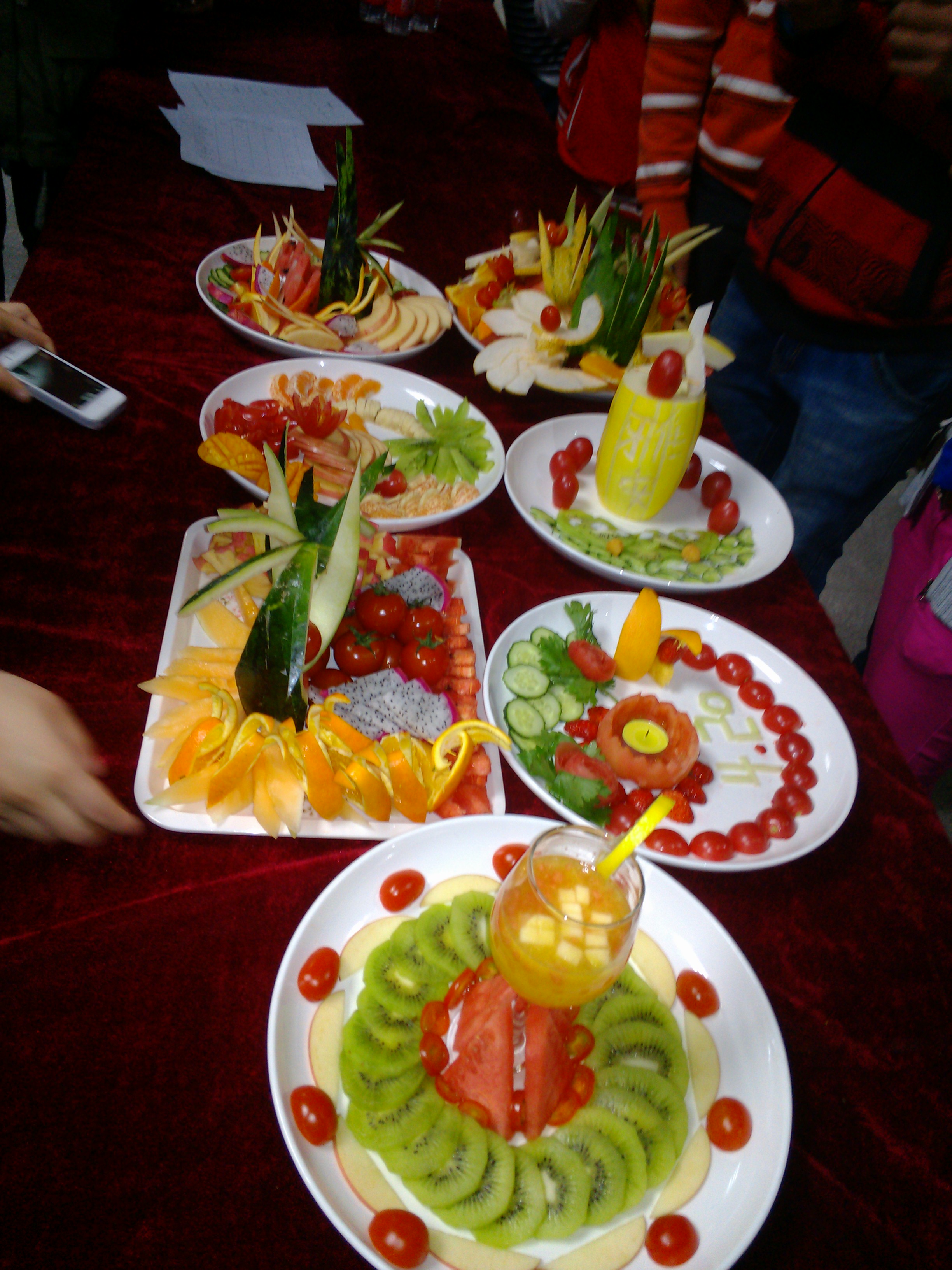 随着主持人宣布开始后,各系选手有序的忙碌着,水果在选手的手中绽放光彩。我系张敏、李建军、沈连鹏以巧妙的颜色搭配,别致的摆放风格,拼出“花开富贵”并获三等奖。在此表示衷心的祝贺。