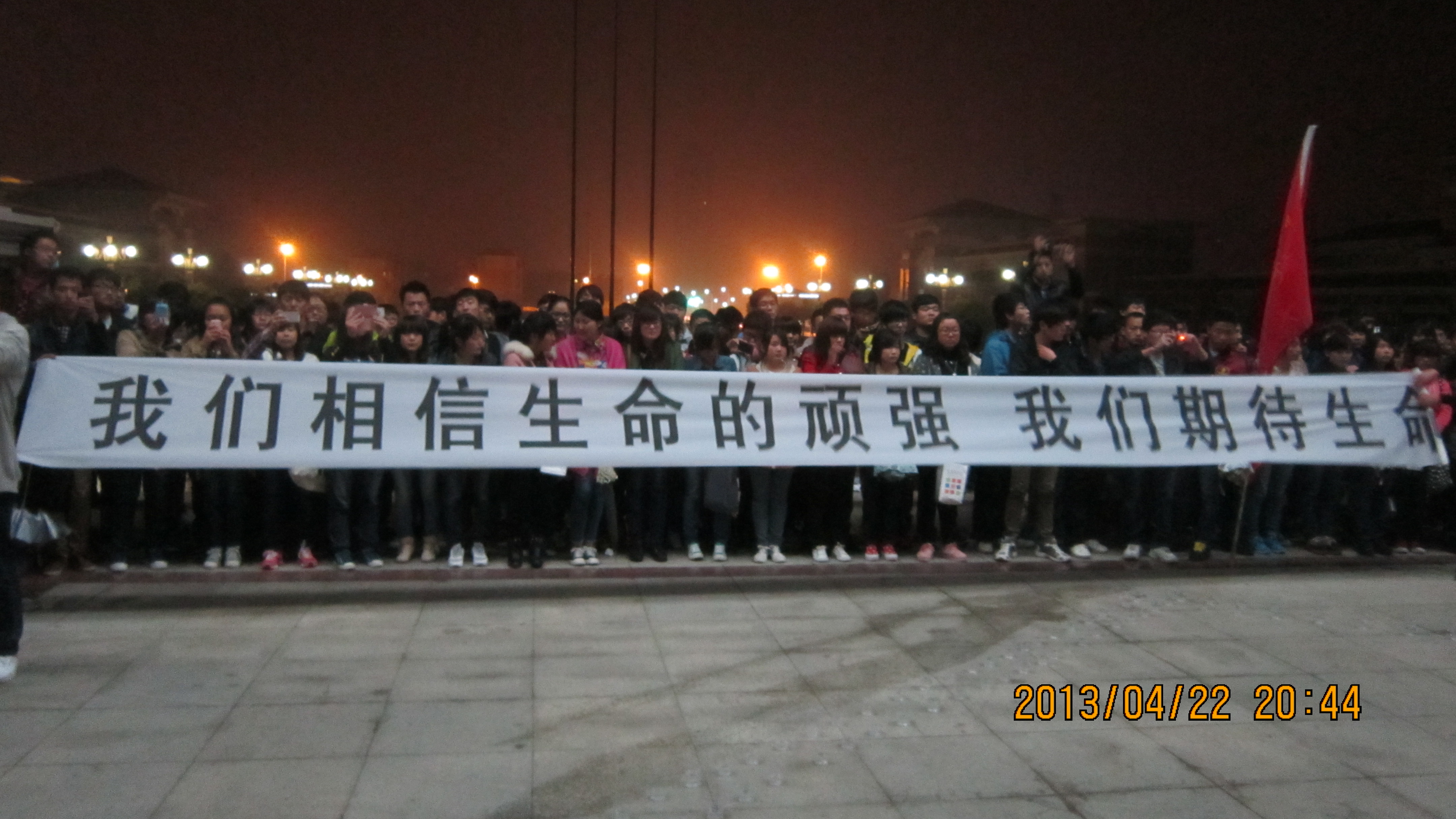 2013年4月20日,四川雅安发生7.0级,顷刻之间,山崩地裂、桥塌路断、房倒屋垮,昔日美丽的雅安顿时满目疮痍,众多鲜活的生命顷刻陨落凋零。我系同学为雅安祈福祝愿,希望雅安的同胞们能够坚强起来。