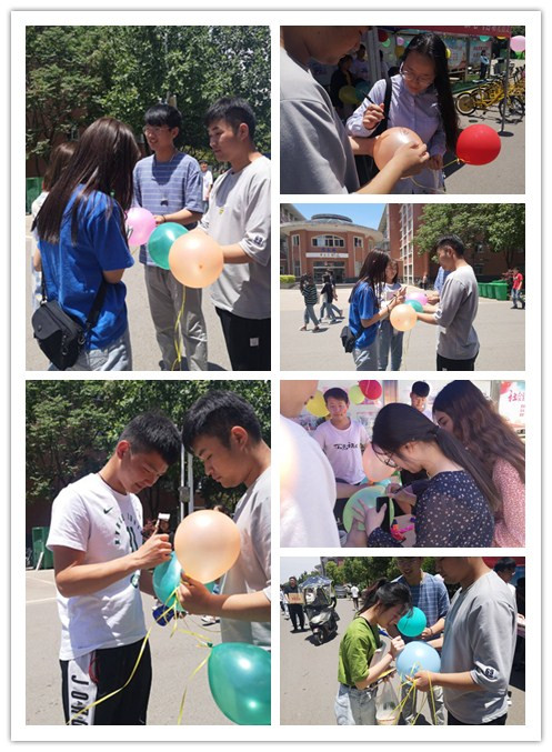 支部成员在女生宿舍楼前搭起帐篷,进行准备工作。他们在校园内征集同学们想对祖国的说的话,让过往的同学们在气球上写下对祖国母亲的热爱以及美好的祝愿。接着,支部成员将那些写满祝福的气球系在了共享单车上,骑手们身着“青春”、“中国”字样的衣服,在校园里骑行,无疑形成了一道靓丽的风景线,在校园里迅速掀起一股爱国热潮。