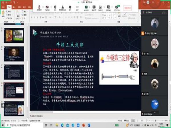 会议中,社团社员赵天峰通过ppt介绍了牛顿的生平简介和主要成就以及著作,还通过讲述牛顿小时候的一些小故事让社团成员们更深的认识到了这位科学巨人,并且介绍了牛顿的一些理论在生活中的应用,引发了大家的深思,认识到知识使得社会进步。最后,以问题导向的方法,提出“牛顿成功的历史经验有哪些?”疑问,引导学生们互动交流,积极思考,潜移默化中让社团成员认识到了学习的积极性以及重要性。