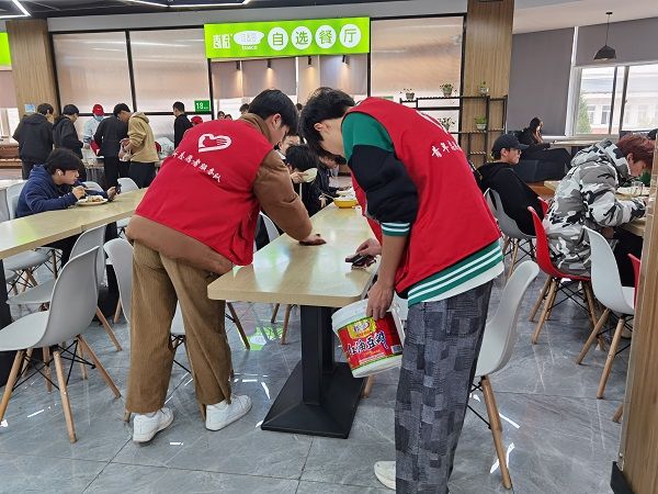 中午11点半,正值食堂用餐高峰,同学们身穿志愿者服装在食堂的一楼到三楼帮助保洁阿姨收拾桌面的饭菜残余。一个小时的劳动,我们体验到了阿姨每天的辛苦。我们也看到了许多同学的铺张浪费。我们提倡“节约光荣,浪费可耻”!幸福生活来之不易,虽然现在生活好了,但还是要发扬勤俭节约的优良传统。