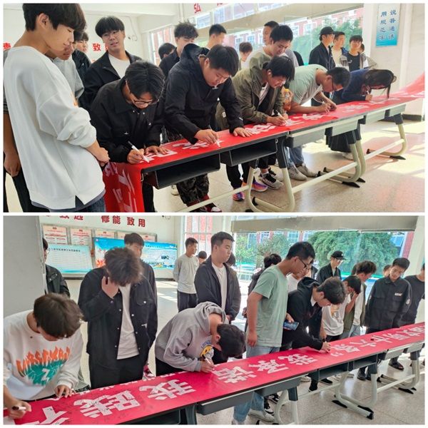 创建文明校园是每一个青年学生共同的责任,同学们在学习完“校园文明十六条”后,纷纷在横幅上签名,并承诺在接下来的学习生活中认真遵守、积极践行,以实际行动构建安全文明的和谐校园。
