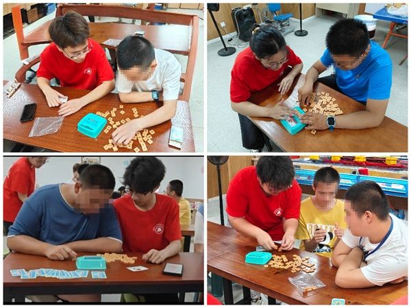 在汉字图片匹配活动中,通过卡片上提示的生活用品汉字,志愿者指导星星孩子读出汉字并找出相应的生活用品图片。