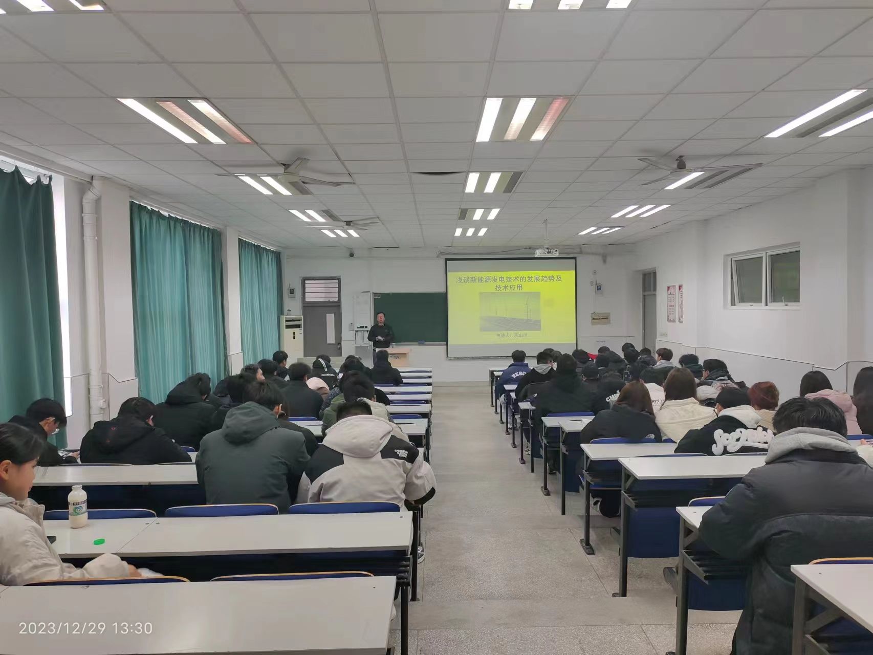 2023年12月29日,电气工程学院朱山川副教授在5102教室作了题为“浅谈新能源发电技术的发展趋势及技术应用”的学术讲座,电气工程学院2023级光伏工程技术、新能源材料应用技术专业共计100名学生参加了此次学术讲座,讲座由燕相松副教授主持。