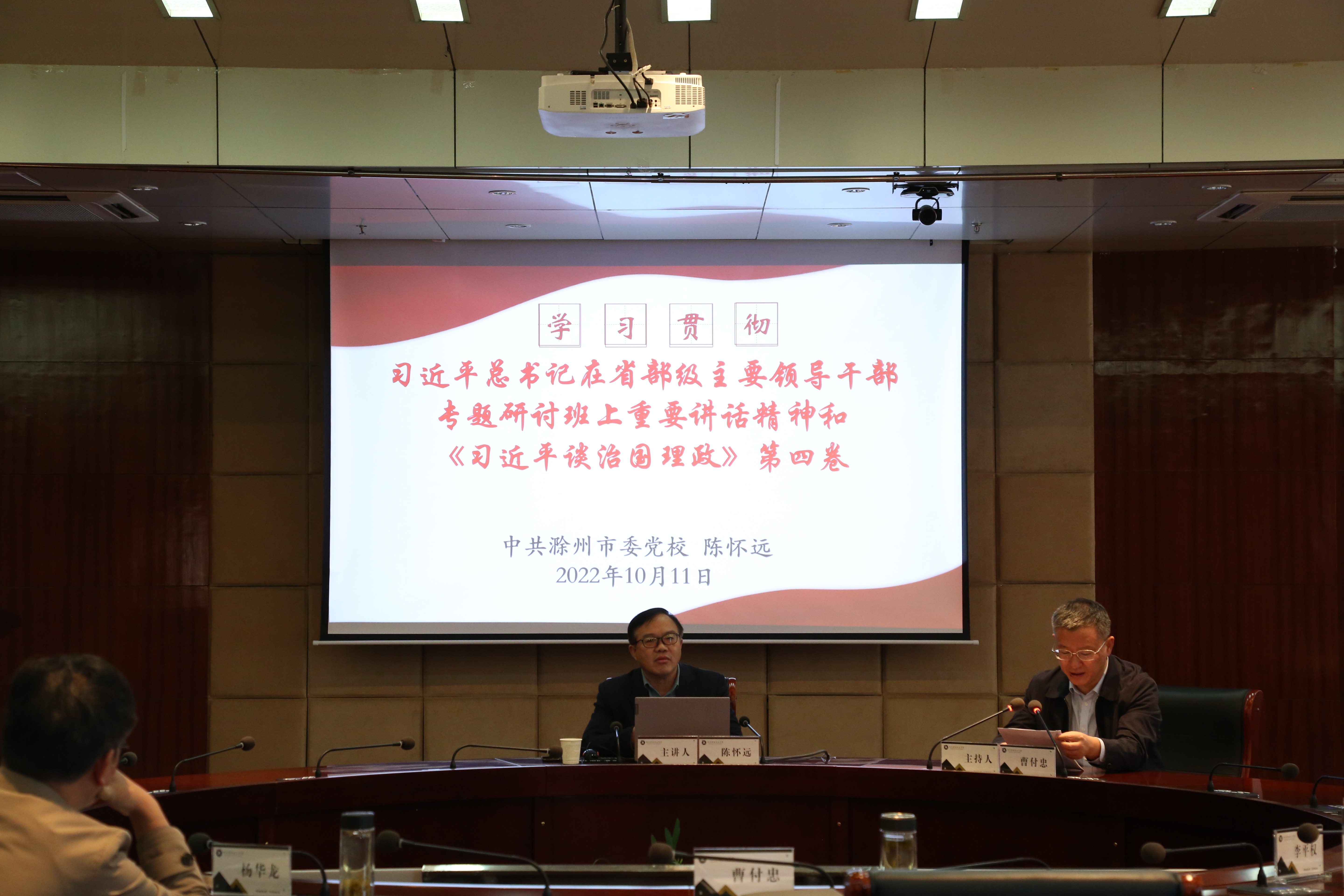 会议邀请市委党校理论研究室主任陈怀远教授作“举旗帜·送理论”学习贯彻习近平总书记在省部级主要领导干部专题研讨班上重要讲话精神和《习近平谈治国理政》第四卷专题宣讲。陈怀远通过学习领会习近平总书记在省部级主要领导干部专题研讨班上重要讲话的重大意义和主要内容;深刻认识学习贯彻《习近平谈治国理政》第四卷的重大意义;准确把握《习近平谈治国理政》第四卷的主要内容和核心要义;学好用好《习近平谈治国理政》第四卷,切实做到“总书记有号召、党中央有部署、滁州见行动”四个部分展开宣讲。宣讲主题突出、观点鲜明,既有对理论问题的提炼升华,又有对现实问题的深入思考,诠释解读准确到位,对大家深刻领会、准确把握习近平总书记在省部级主要领导干部专题研讨班上重要讲话精神和《习近平谈治国理政》第四卷的思想体系、核心要义和实践要求起到积极作用。