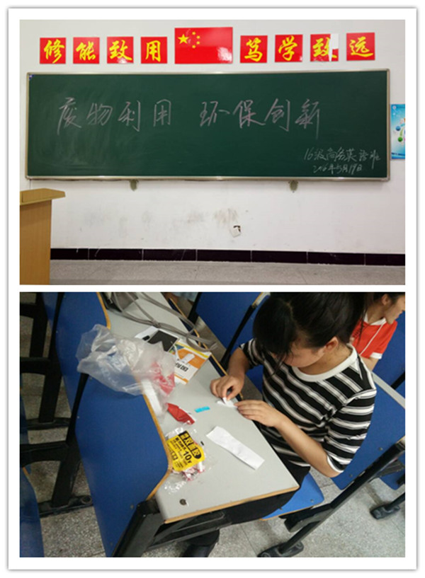为了提高同学们的创作能力,充分利用废旧资源,保护环境。2017年5月19日下午16:00经济贸易系16级商务英语班在1107教室开展了废物利用,制作小工艺品的创意比赛。